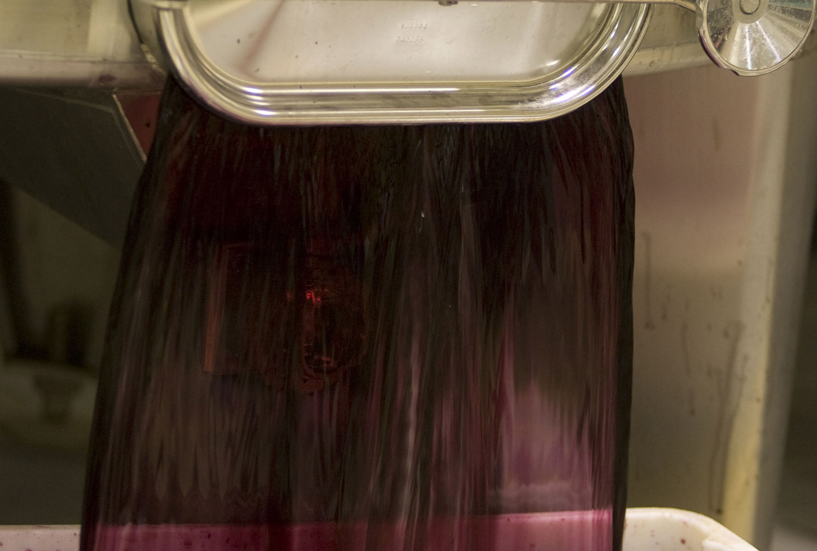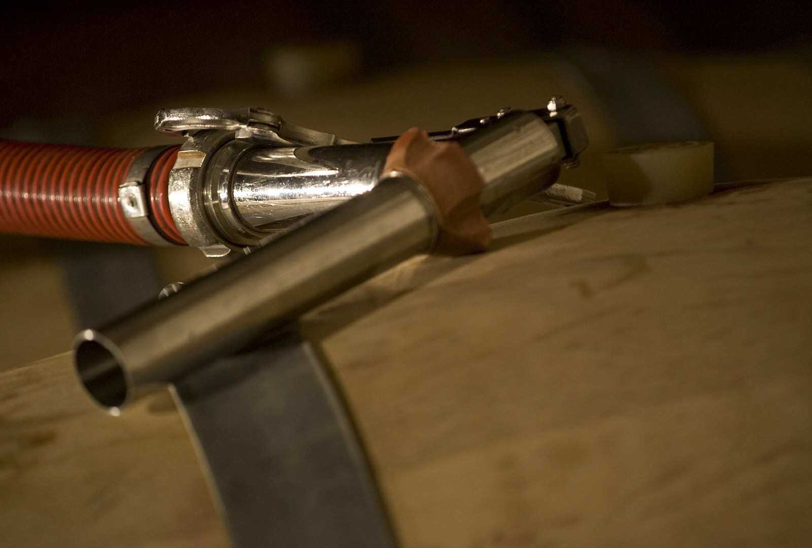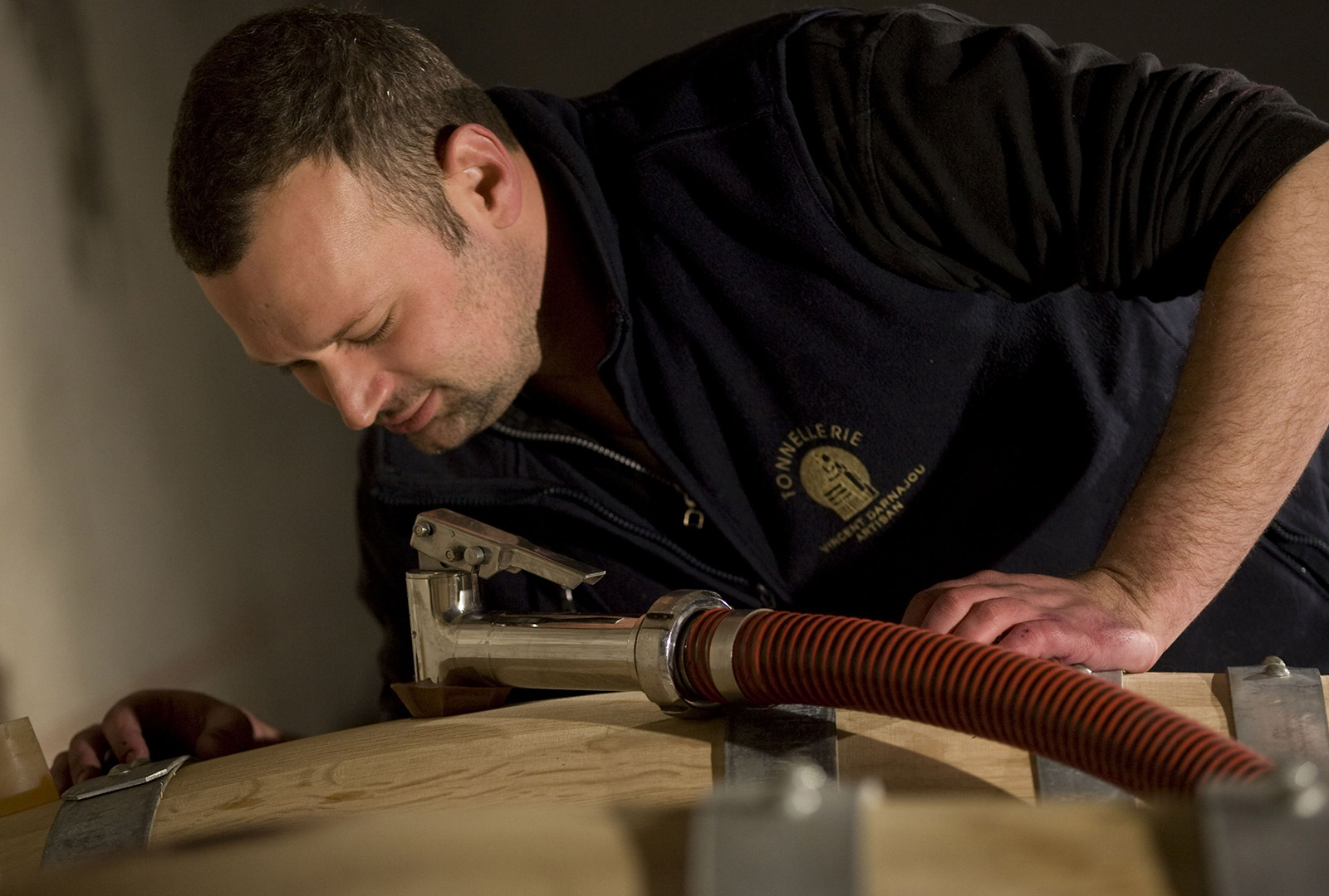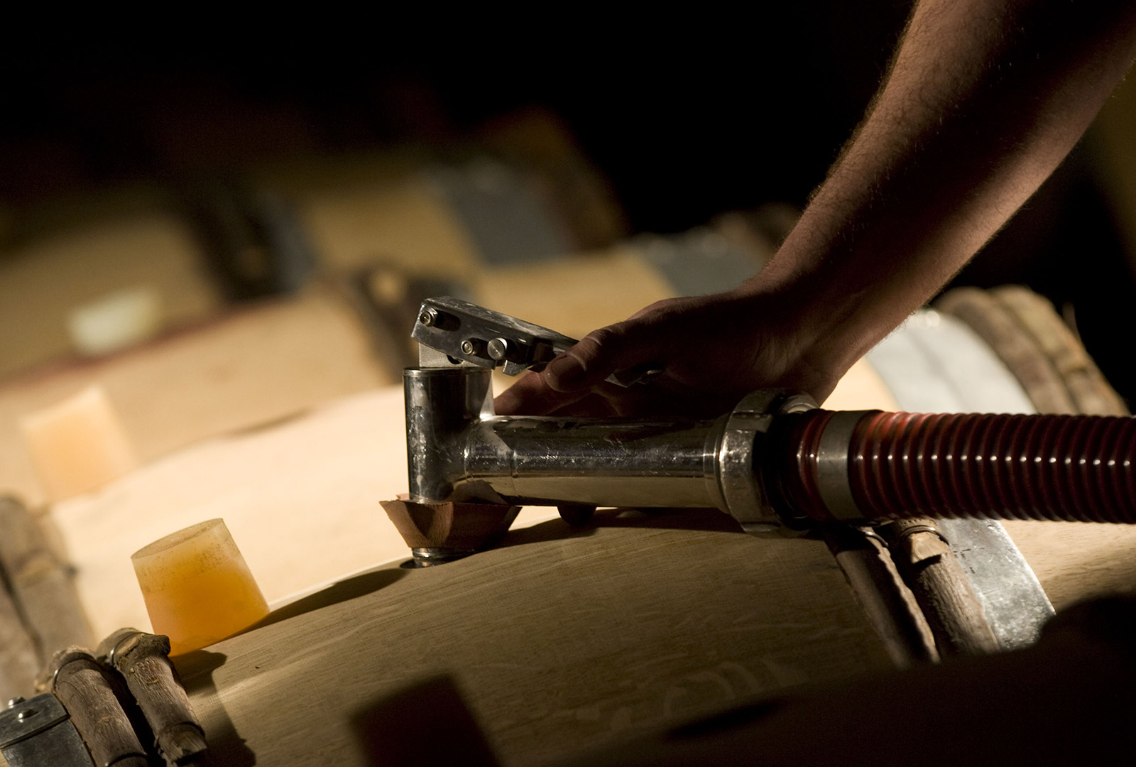L’entonnage, un geste précis qui perpétue la tradition. Au Domaine Chasson – Château Blanc, chaque barrique est remplie avec soin, dans le respect du vin et de son évolution.